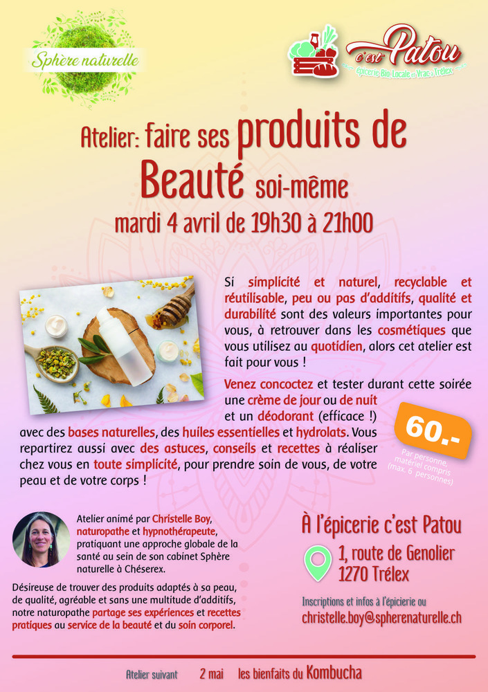 En avril, l'atelier donné par Christelle va nous chouchouter : venez apprendre à faire vos produits de beauté