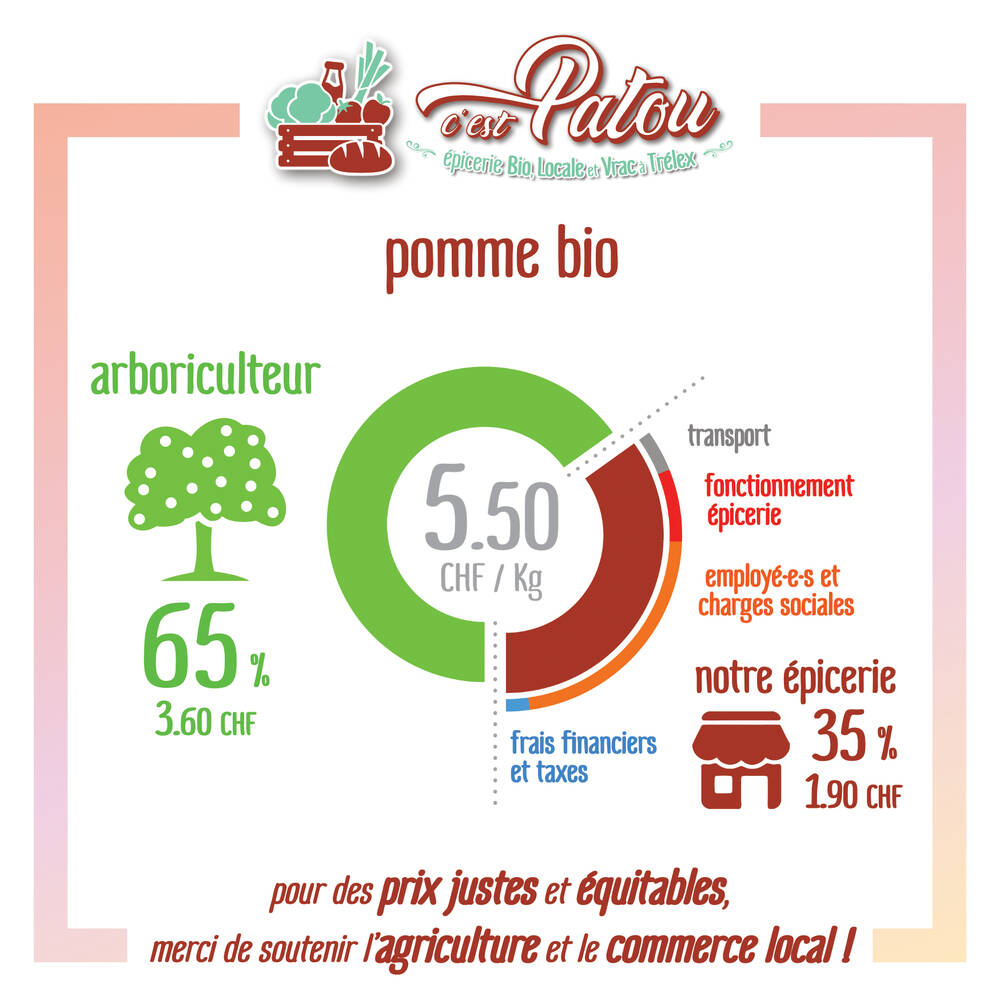 Nous achetons directement nos pommes BIO (Juliette pour cette exemple) à son producteur à Aubonne que nous payons 3.60 CHF par kg, que nous revendrons sur nos étales au prix de 5.50 CHF. Sa part est donc de 65% du prix final de vente.