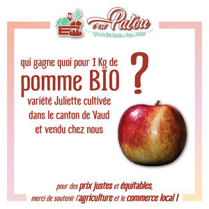 Aujourd'hui: qui gagne quoi pour 1 Kg de pomme BIO variété Juliette cultivée dans le canton de Vaud et vendu chez nous?