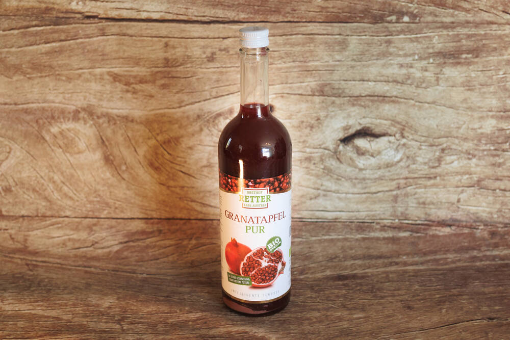 Extrait naturel des grains de grenade, non filtré! Pour produire le jus de grenade, la Maison Retter n'utilise que les grains rouges de grenades parfaitement mûres – sans la peau ni les membranes internes – issues d'une variété soigneusement sélectionnée provenant des meilleurs terroirs. Riche source d'antioxydants (flavonoïdes).